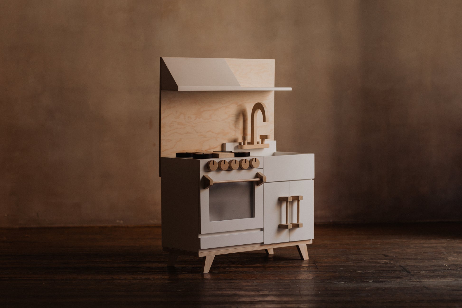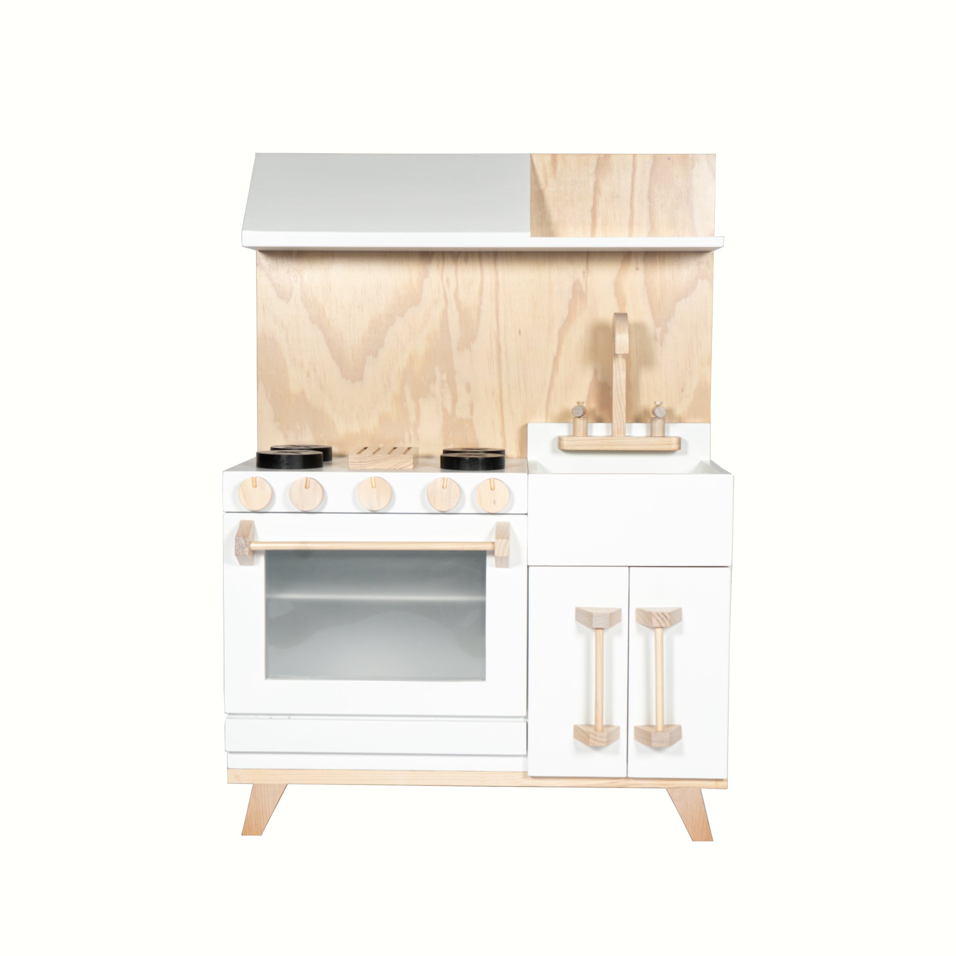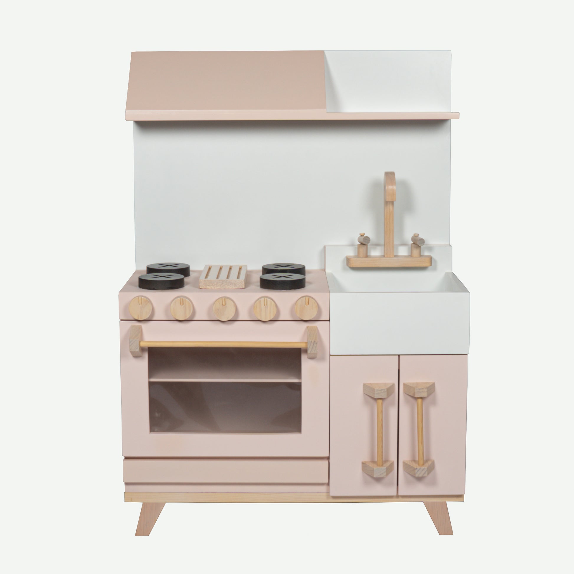Cocinita hecha de madera de pino y MDF , con accesorios móviles y hornito con puertitas abatibles.