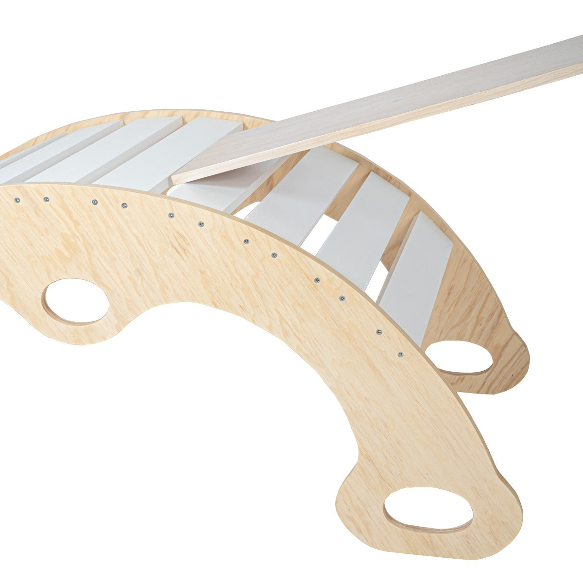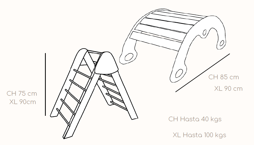 Set extra grande: Triángulo de 90 cms de alto, balancín de 1.15 mts de largo y tabla resbaladilla. El balancín puede ser usado por 2-3 niños, que en su conjunto pesen hasta 100 kgs.